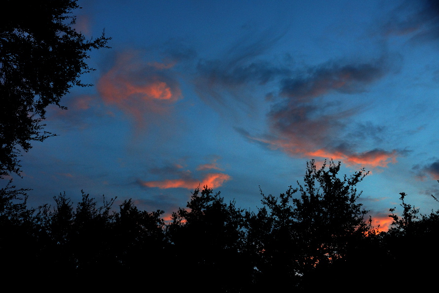 I'm reading Extraordinary Everday Photography and trying out some ideas regarding light and exposure. This evening, 7 minutes after local sunset, I decided to try to get some photos of the pink twilight reflecting off the clouds. The objective was to see if I could capture the shades of pink twilight being reflected off of the clouds. As an added benefit, this image captured what looks like a lady's face, hair, and neck (left upper cloud mass), with her right arm over her head.